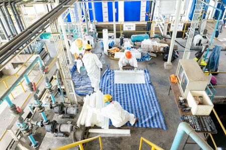 Group of skillful factory workers using machine equipment in workshop . Industry and engineering people technology concept .