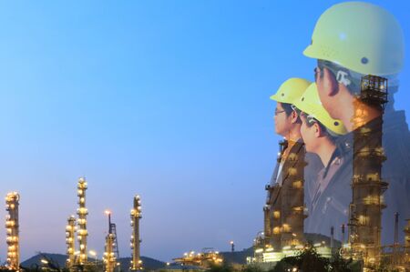 production engineer with Refinery oil plant factory background. Mixed media of welding robot in the automotive parts industry