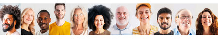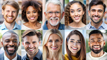 A composite image showcases a grid of diverse individuals, all smiling broadly. The portraits reveal a range of ages, ethnicities, and genders. The lighting appears soft and even, highlighting the expressions. The images could be used for various commercial purposes, such as illustrating positivity or representing a community.