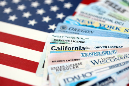 Big amount of driving licenses from different USA states on flag close up. Stack of driving license specimen cards