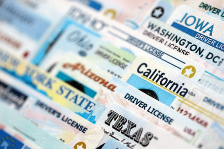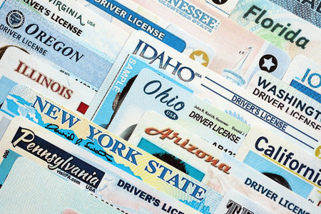 Big amount of driving licenses from various USA states. Stack of driving license specimen cards