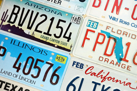 Old US car license plates with various state names. Concept of driving in United States. Reaching a car registration
