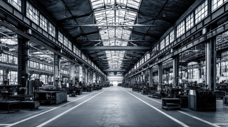 Factory Machinery Industrial Hall Interior Long perspective view of a vast factory floor with heavy machinery and overhead cranes in a dimly lit industrial building