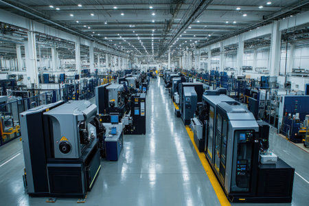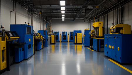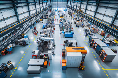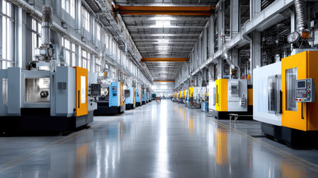 A modern industrial manufacturing facility showcasing advanced machinery and tools. The image captures a spacious workspace filled with high-tech equipment and efficient design.