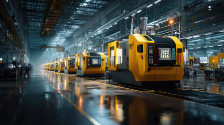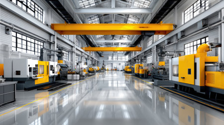 Explore a bright and spacious industrial manufacturing facility showcasing yellow equipment and tools. This organized workshop environment highlights modern technology and efficient design.