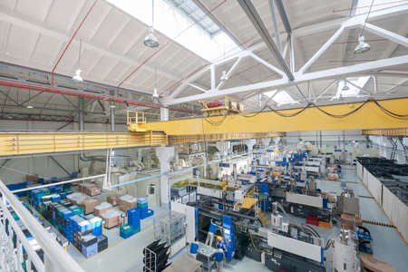 Different contemporary automated machine tools installed to process material and produce goods in light workshop of production plant