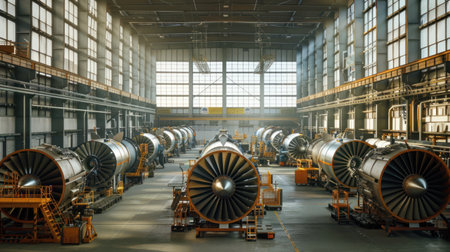 A captivating view of a vast industrial space featuring a gigantic jet engine, highlighting the precision of aerospace engineering and technology.
