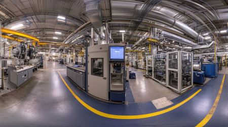 A panoramic view of a modern manufacturing facility showcasing advanced machinery and technology in a spacious industrial environment.