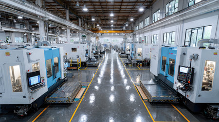 A modern manufacturing facility featuring numerous CNC machines, emphasizing automation and efficiency in a bright and spacious environment.