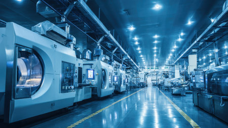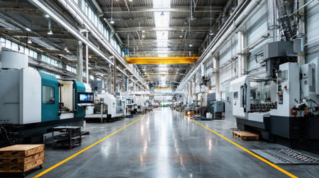 A modern manufacturing facility showcasing advanced machinery and bright industrial lighting, ideal for precision engineering and efficient production processes.
