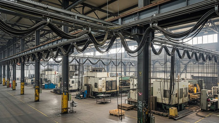 Heavy showing industrial factory interior with machinery and cables keywords: factory, industrial, manufacturing, machinery, equipment, workshop, production, industry, interior, large scale, heavy machinery, engineering, technology, power, cables, pipes, warehouse, plant, metal, steel, concrete, industrial design, production line, automation, industrial space, commercial, manufacturing facility, industrial equipment, industrial setting, industrial interior description: the interior of a...
