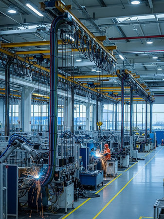 An automotive factory assembly line with robotic arms performing welding, creating sparks, under bright industrial lighting and extensive ductwork.