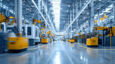 A detailed view of a modern manufacturing facility showcasing advanced robotics and machinery, highlighting the efficient workflow and the spacious industrial environment.