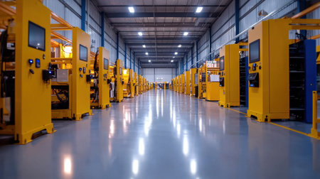 A modern industrial manufacturing facility showcasing advanced machinery and robotics. Bright lighting reflects off polished floors, highlighting innovation.