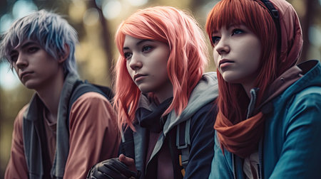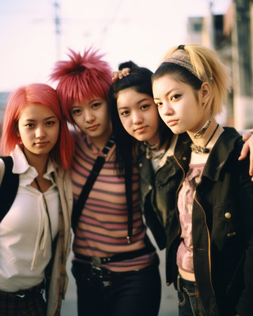 Group of young asian women with colorful hair standing in the city