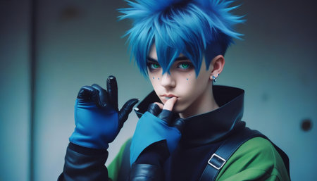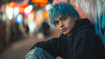 a rebellious young man with tousled, electric blue hair leans against a graffiti wall, smirking playfully. He wears a black hoodie and ripped jeans, and the blurred background features a grungy urban alley with neon lights
