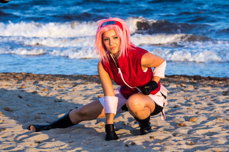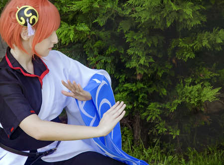 Istanbul, Turkey - Mayer 29, 2016: Kadikoy, on the beach Asia Day 2 was named cosplay day activity. Participants dressed as anime characters cosplay indicated they did. Participants Gintama Kagura costume cosplay girl in the photo.