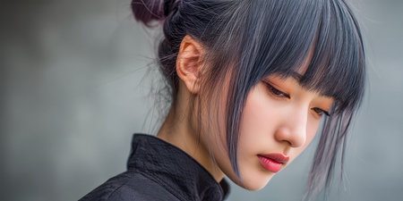 A young woman with dark hair styled in a bun looks thoughtfully downwards. She wears a black top, and her expression is serene, set against a soft, muted background.