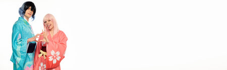 woman in kimono sticking out tongue and showing heart sign with anime style man on white, banner