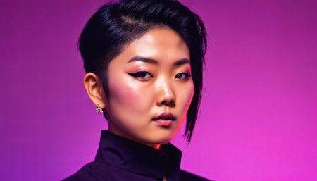 Beautiful asian woman in pink jacket with colorful lights on background.