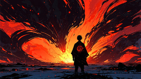 A silhouette of a person standing before a fiery explosion in the sky. The colors are mostly red, orange, and black