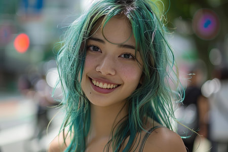 A young woman with green hair, smiling in the street