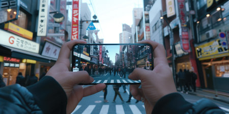 Close up of smart man hand holding camera while record video at japanese road or city street. Attractive people holding telephone or cell phone while recording view as japanese background. AIG42.
