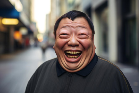 Portrait of a funny asian man laughing in the street.
