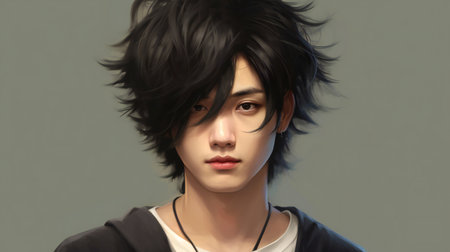 Portrait of young Asian man with dark long hair in traditional clothes looking at camera