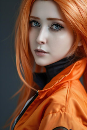 Close-up portrait of a beautiful redhead girl in an orange jacket