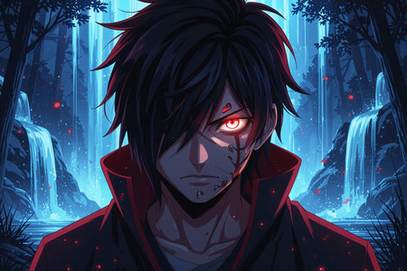 Fantasy illustration of a female vampire in a dark forest with a waterfall