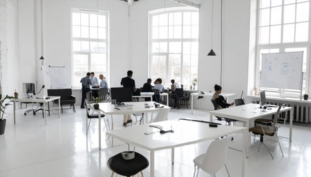Modern minimalist open plan office design featuring ergonomic workstations in a clean layout