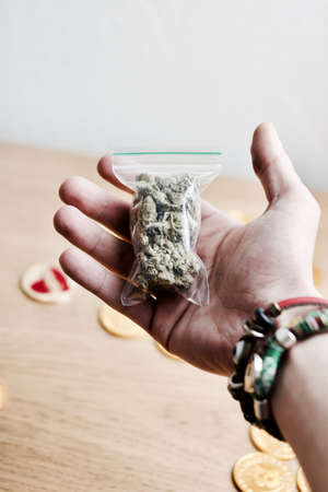 prohibition of semi-legal smoking mixtures: a bag with synthetic marijuana called spice is compressed in a man's fist, on a light background