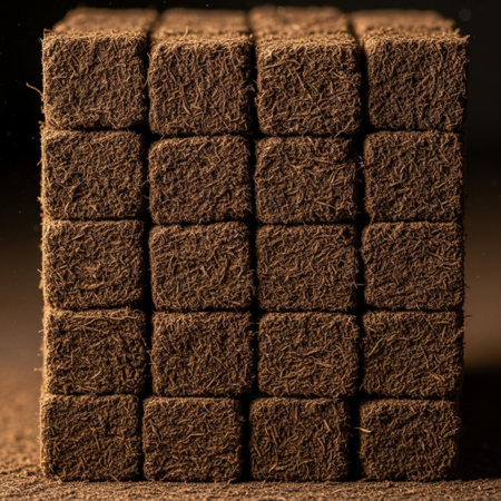 Hero detail shot featuring a central, tightly stacked, geometric arrangement of dark brown peat fuel