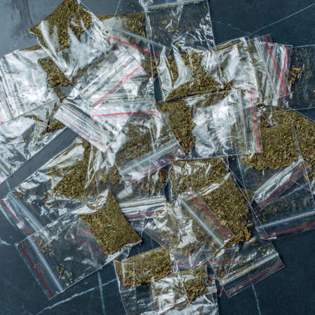 crime evidence: many packaged doses of cannabis lie on a dark surface