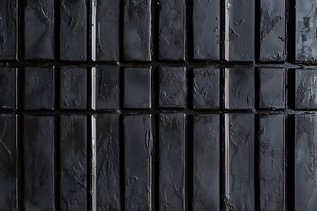Captivating close-up showcasing a pattern of glossy black rectangular tiles, exhibiting unique textures and subtle reflections. Perfect for backgrounds and abstract designs.