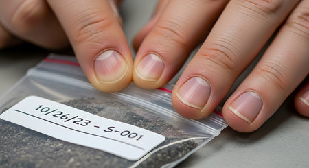A close-up of a scientist's or researcher's hands holding a clear plastic evidence bag containing a soil, seed, or powder sample. The bag is labeled with a date and sample number, suggesting themes of scientific research, forensics, geology, or agricultural analysis.