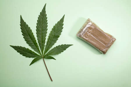 hashish tablet with marijuana leaf, green background