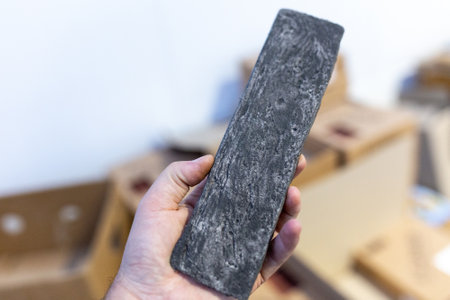 An overhead shot reveals an arrangement of dark, rectangular objects with unique cracked textures. The objects, varying in shades of grey, are positioned against a bright white backdrop. This image could be suitable for abstract design projects, or could be used to illustrate concepts related to patterns and surfaces.