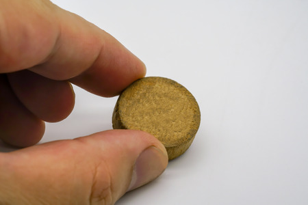 Hand holding small circle piece of wood isolated on white background