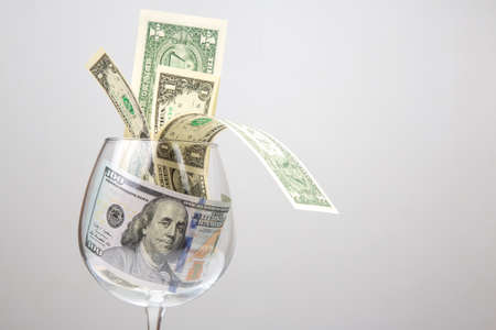 dollar money in an empty wine glass. Online business sale. Financial success in the trading business.