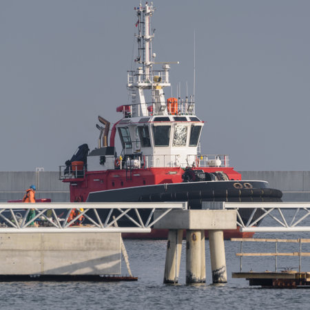 Swinoujscie, Poland - September 12, 2020: Tugboat escorting a ship on the way to the port of Swinoujscie on the Polish coast of the Baltic Sea