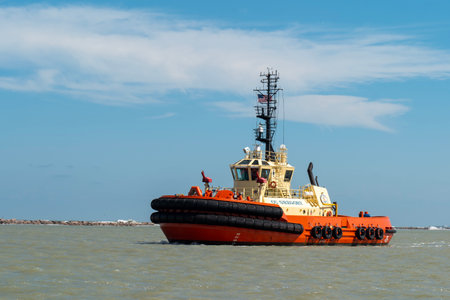 Constanta, Rumania - August 06: Tugboat after mooring operation in port of Constanta on August 06, 2016 in Constanta, Rumania.