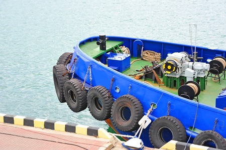 A marine tugboat is docked at the pier. Tugboats take international ships out of port to continue sailing