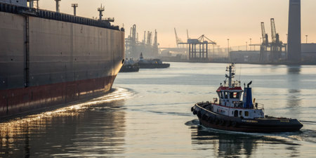 A large cargo ship rests at the port while a tugboat maneuvers nearby, creating gentle ripples in the calm water during the early morning light. The silhouette of cranes stands in the background.