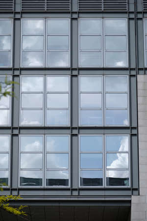 The glass window pattern on the building wall with the cloud reflection in the urban area, front view with for the background.