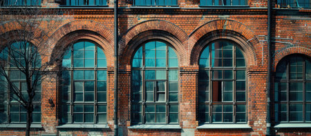 A red brick urban facade with modern windows, blending the old and new elements of city architecture, in a vibrant city neighborhood.