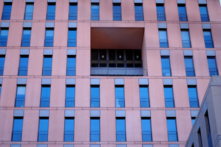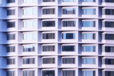 This view highlights a facade of an apartment building with multiple rectangular windows arranged in a symmetrical grid. The design emphasizes urban architecture and modern living.