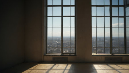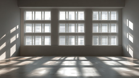A bright and spacious interior featuring large windows that allow natural light to flood in, creating inviting shadows on the floor. The minimalist design emphasizes tranquility and modernity with clean lines and open space, perfect for various creative purposes.