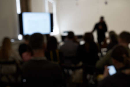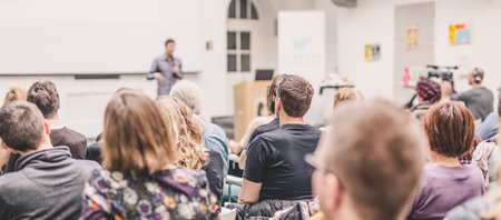 Conference and presentation. Audience listening to speaker.